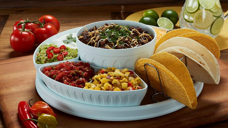 Then to fit all of the condiments — because what is taco night without condiments? — there is a tray that fits around the main bowl. Each of these are divided into two, so there is enough room for six different toppings. And you know guac doesn’t cost extra at home, so no judgement if you use two trays for it.